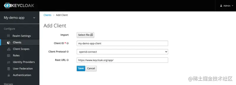 打开你的应用程序的管理控制台 Keycloak(http://localhost:8089/auth/admin),用你的管理证书登录。点击 客户端在左边的菜单上,点击 创建 按钮,位于客户表的顶部。然后填写下图所示的表格,并点击保存按钮。