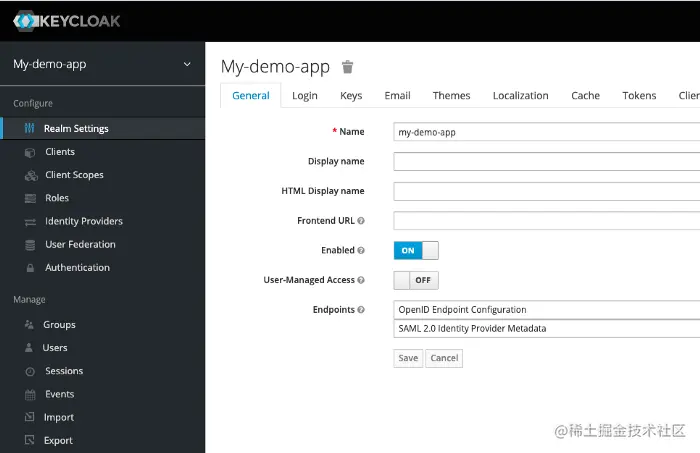 钥匙环我们提供了一个样本应用程序,你可以用它来尝试你的服务器,而不需要自己编写一个假的应用程序。这个应用程序可以通过以下网址(https://www.keycloak.org/app/)访问,这个网址就是我们在 根网址 字段中输入的。