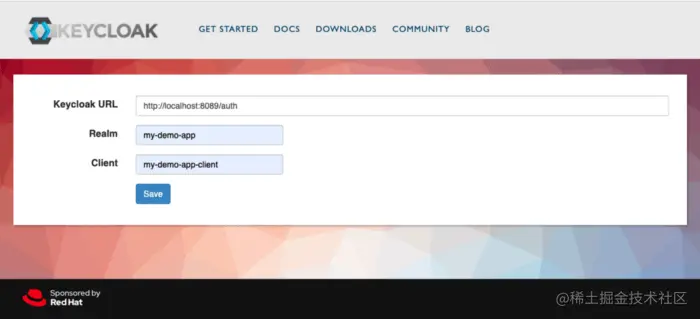打开一个浏览器标签,输入样本应用程序的网址(https://www.keycloak.org/app/)。然后在表格中填写我们的Keycloak实例运行的网址(http://localhost:8089/auth),以及我们的境界和客户端的配置。 Keycloak。 如果你已经按照教程的要求,你的配置应该如下。