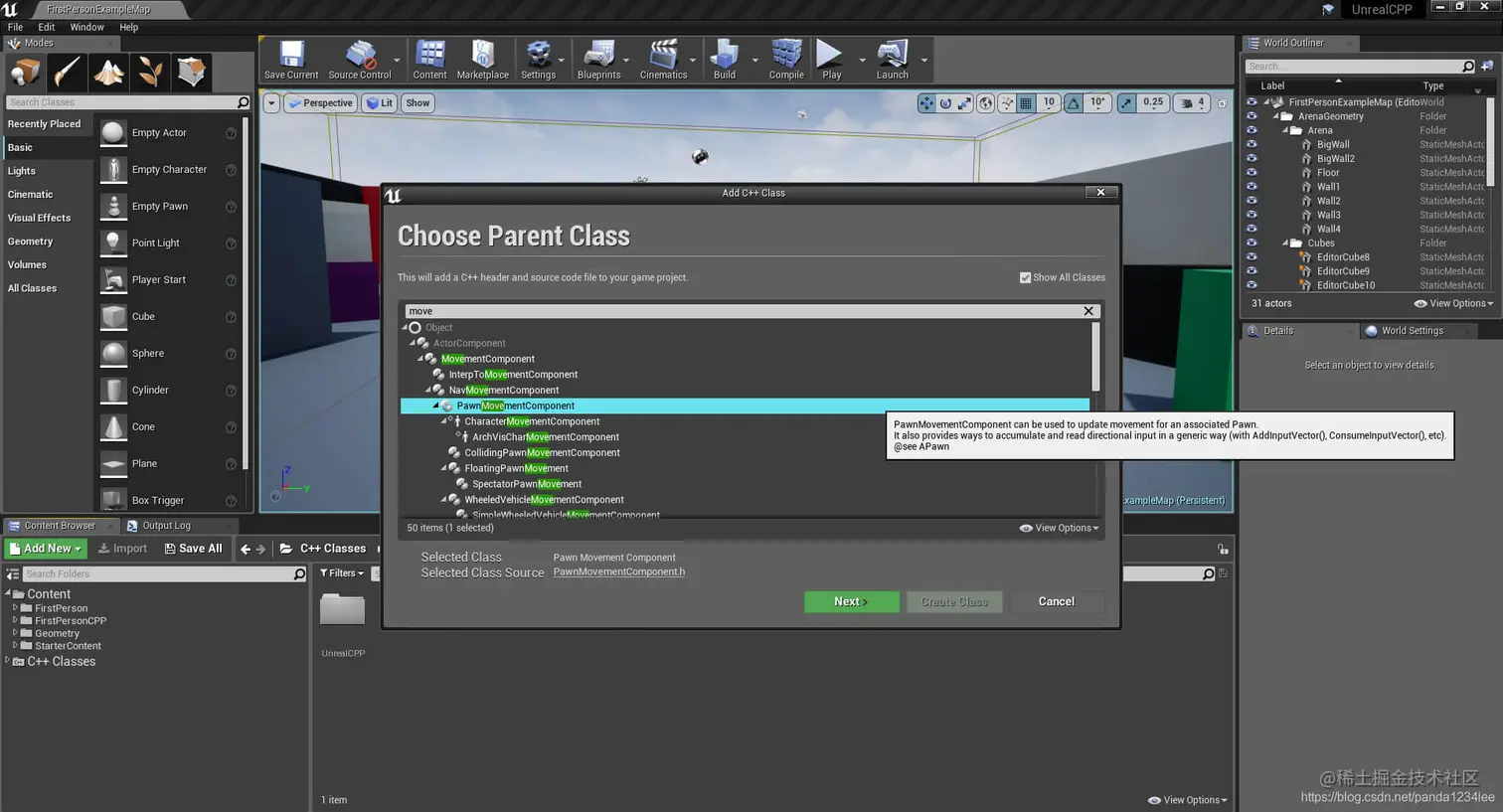 在本教程中,创建一个新的 C++ 类,继承 UPawnMovementComponent 的父类,并将其命名为CollidingPawnMovementComponent。我们将在稍后创建的 pawn 中使用这个组件。