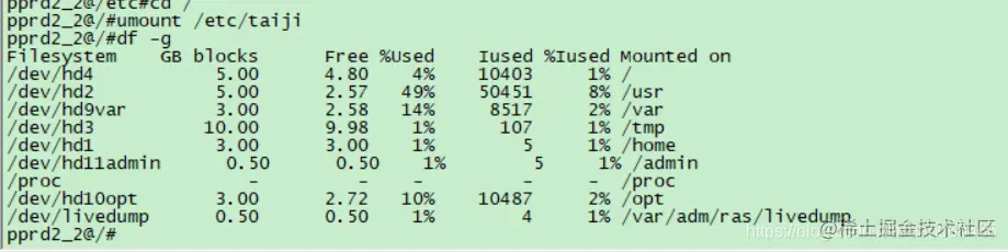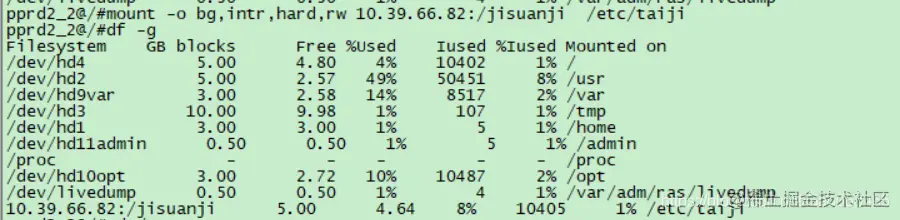 这里之所以要加上-o bg,intr,hard 这些参数,是因为我并没有在/etc/filesystems将这个NFS文件系统注册。