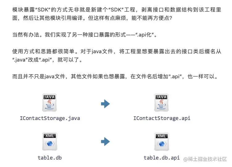 一些列的问题接踵而至,于我而言影响最深的就是应用设计时使用映射型数据库,导致集成模式和组件模式中复用出现问题;最终使用注解配合Java特性生成代码,虽然不完美但是依然解决了此问题。正当我为了胜利欢呼的时刻,一片《微信Android模块化架构重构实践》文章进入我的眼帘。