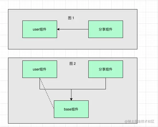 将user组件中的公共数据部分下沉到base组件,分享组件依赖base组件即可实现数据提供,然而当非常多的组件需要互相提供数据时,将出现中心化问题,只需要分享组件的B组件不得不依赖base组件,引入其他数据。也就造成了代码中心化下沉失去组件化的意义。