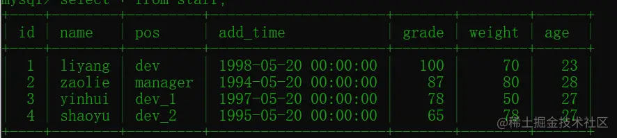 执行 select * from staff: