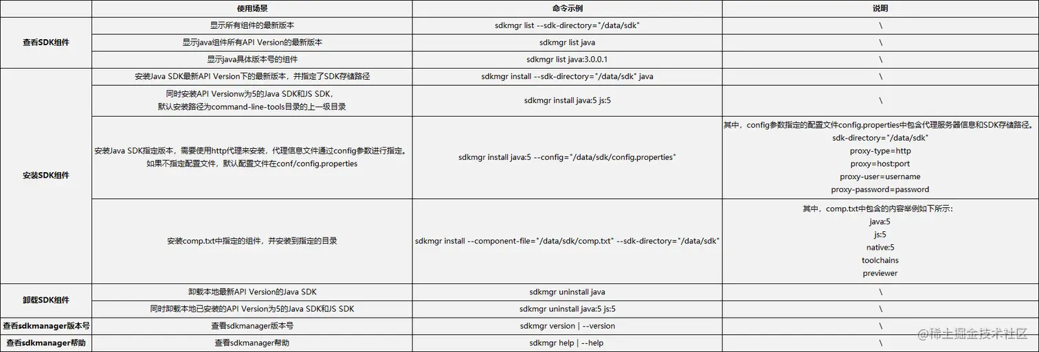 关于SDK组件执行查看/安装/更新/卸载等命令示例及使用场景,可以参照以下表格: