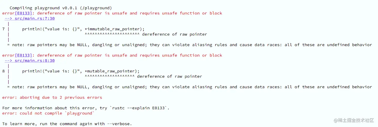现在代码编译成功了。不安全块阻止了编译器检查块中的内容,因为我之前说过,解引用原始指针是其中之一。因此,代码的编译没有任何问题。