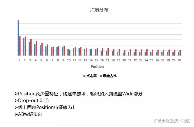 于是,我们开展了去Position Bias的工作。首先采用了较为常规的方法,利用Position特征以及少量上下文特征,构建了单独的Position塔,并将其输出加入到模型Wide部分。上线实验后效果较差,经分析,我们发现了Position特征与Label相关性过高,离线的模型非常依赖它,Position特征线上线下不一致性对指标影响非常严重,线上全部填1后AB指标降幅较大。