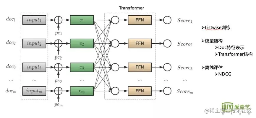 由于Transformer非常适合上下文场景感知的学习,于是我们在SE-Rank的基础上进行了优化。整体模型结构是输入层接入Transformer结构,更利于当前Doc对所有候选Doc注意力及上下文影响的学习。