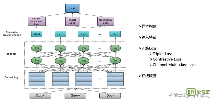 整体Loss中,首先是Triplet Loss,主要学习正负Doc之间的序关系。另外,我们会加一个对比学习的Loss,以避免模型坍塌。第三,我们还会加入频道多分类的loss,用以提高整体语义的学习。