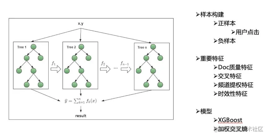 整体模型构建采用树模型的方式,以减小线上压力。整体来看,粗排阶段的Doc质量分、交叉特征、时效性等特征重要性较高。