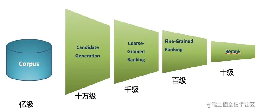 爱奇艺综搜场景下,全量Corpus为亿级别,召回阶段候选集为十万量级,粗排为千级,精排为百级,Rerank为十级,最终展现到用户UI界面中。