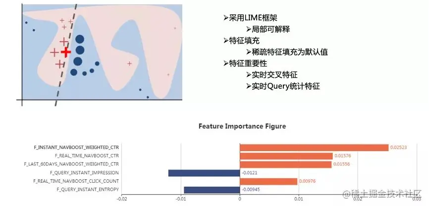 **具体实现逻辑为:**稠密特征扰动主要是对当前每个特征随机加减或者乘以一定的系数,构建一系列新的特征,同时,稀疏特征部分会用默认值填充。然后将包含原始特征数据在内的所有特征数据为输入,逐个依次访问线上模型,获取到对应的输出得分,这样可以得到包含本身样本及扰动后样本的集合,并进行LR的训练学习。LR是可解释性很强的机器学习方法,每个特征的权重可以表达特征的重要性以及正负相关性。