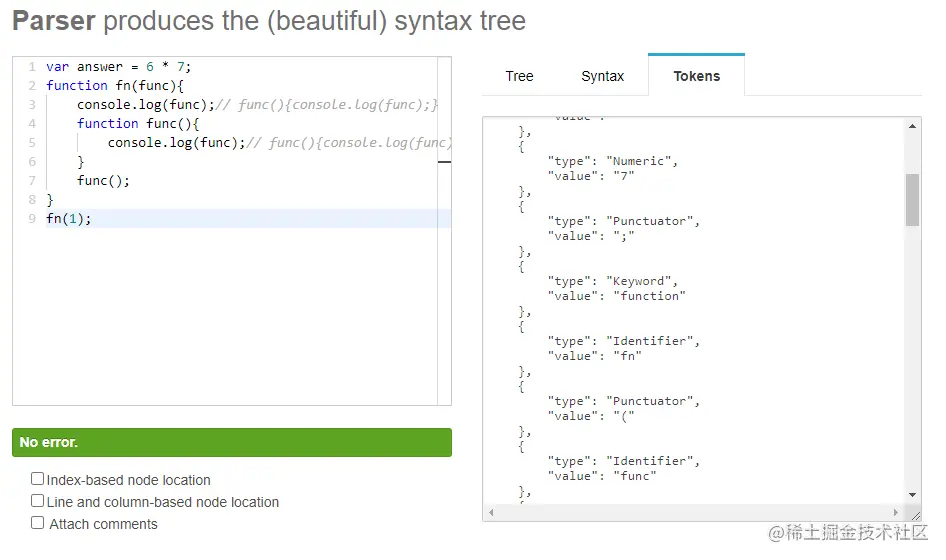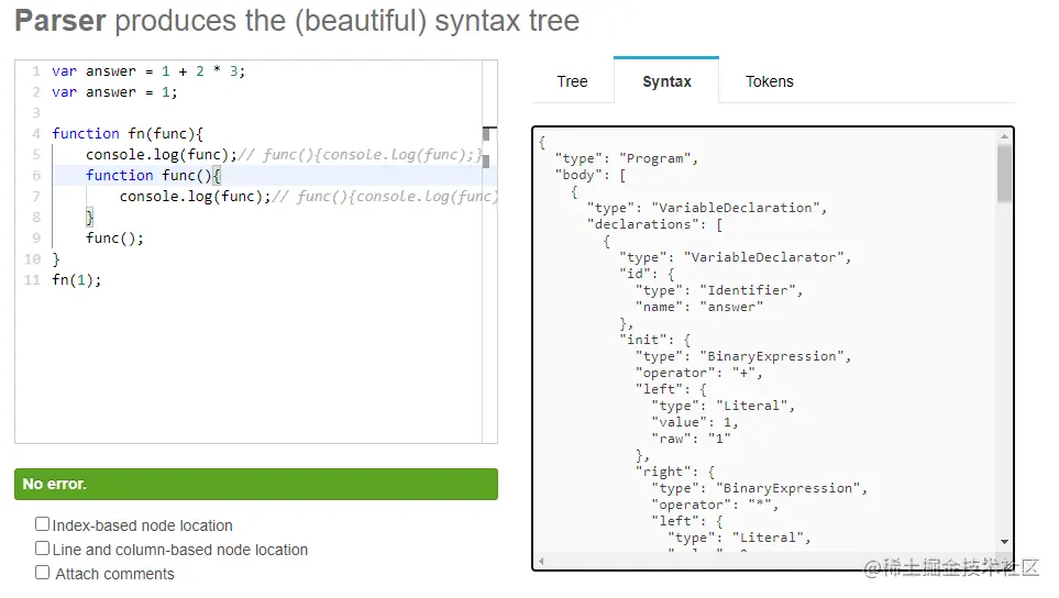 词法分析: ( esprima.org/demo/parse.…)就是分析代码或函数的一些变量,声明的处理.从字符流(char stream)转换为记号流(token stream)这些代码块被称为词法单元。例如,考虑程序 var a = 2;。这段程序通常会被分解成 为下面这些词法单元:var、a、=、2 、;。空格是否会被当作词法单元,取决于空格在 这门语言中是否具有意义。