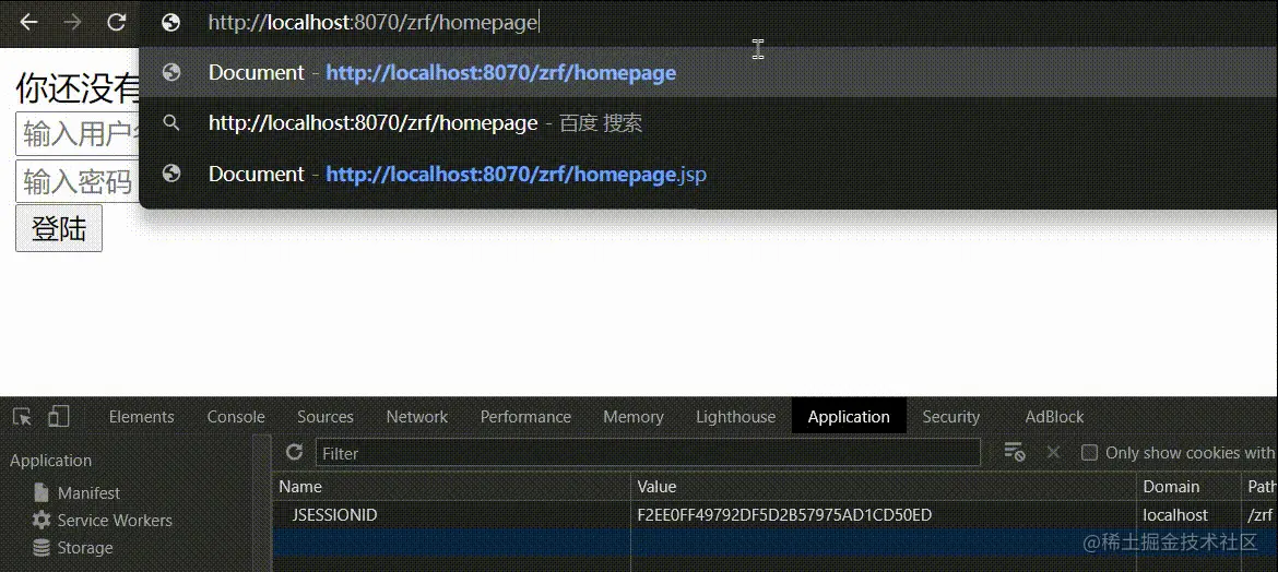 在第一次访问homepage页面时,看到浏览器缓存区并没有名为username的Cookie,只有当登录之后,浏览器缓存区才有了这个Cookie。