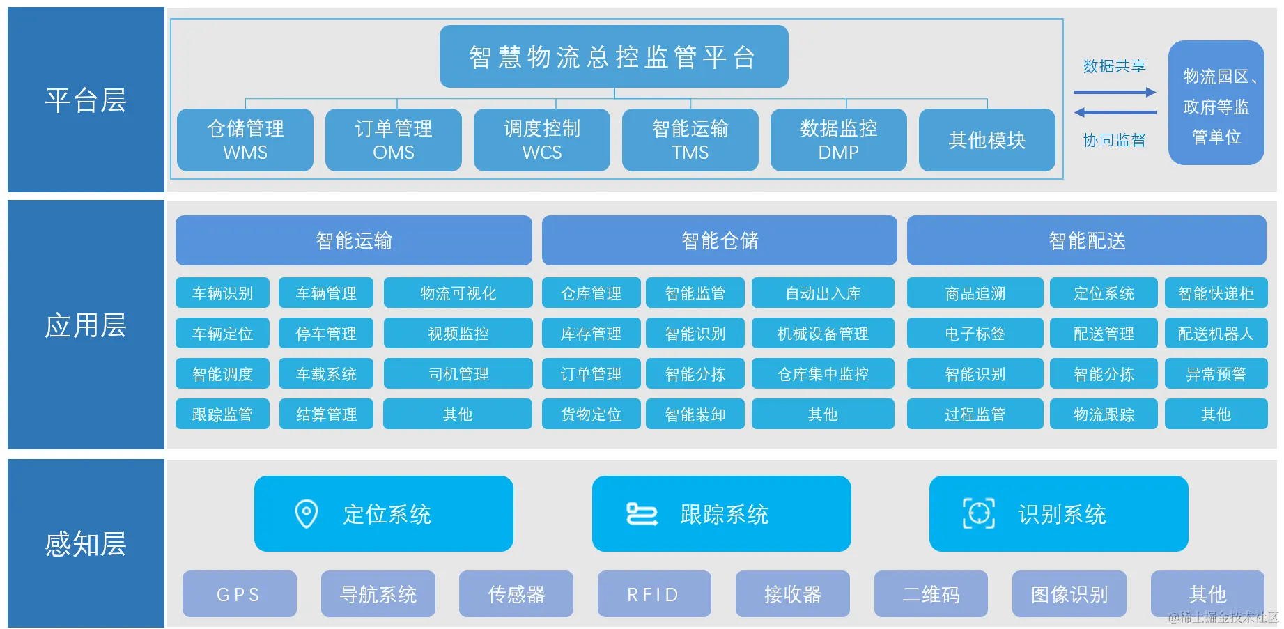 智慧物流:围绕“互联网+物流”概念,采用物联网、人工智能、大数据、云计算、智能硬件等先进技术与设备,构建物流智能化综合管理平台,并覆盖物流各个环节,如包装、运输、仓储、装卸搬运、配送等,实现物流系统的数据采集、智能感知、分析和处理能力,从而达到物流系统中各个单元高效率、高质量、低成本协同运作的目标,助力物流行业降本增效。