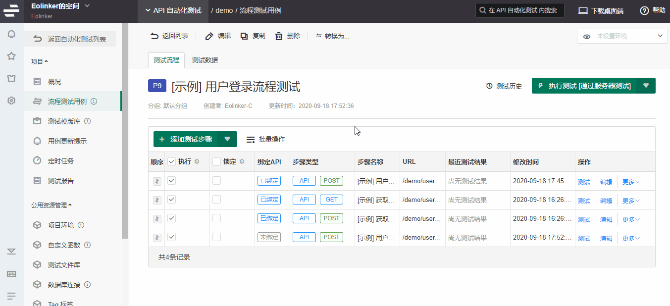 这期抽出来的问题是关于如何使用Eolinker自动生成接口自动化测试用例,也就是将API文档变更同步到测试用例,下面是流程的示例解析。