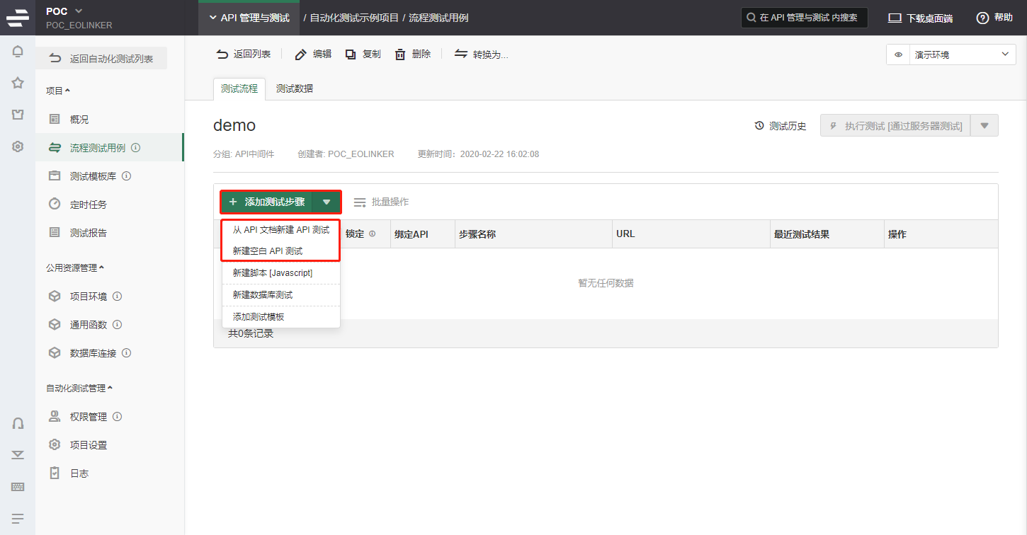 进入流程测试用例详情页,点击添加测试步骤,在下拉菜单中选择“从 API 文档新建API测试”,根据指引进行操作即可,这时会自动将测试步骤关联相应的API文档。