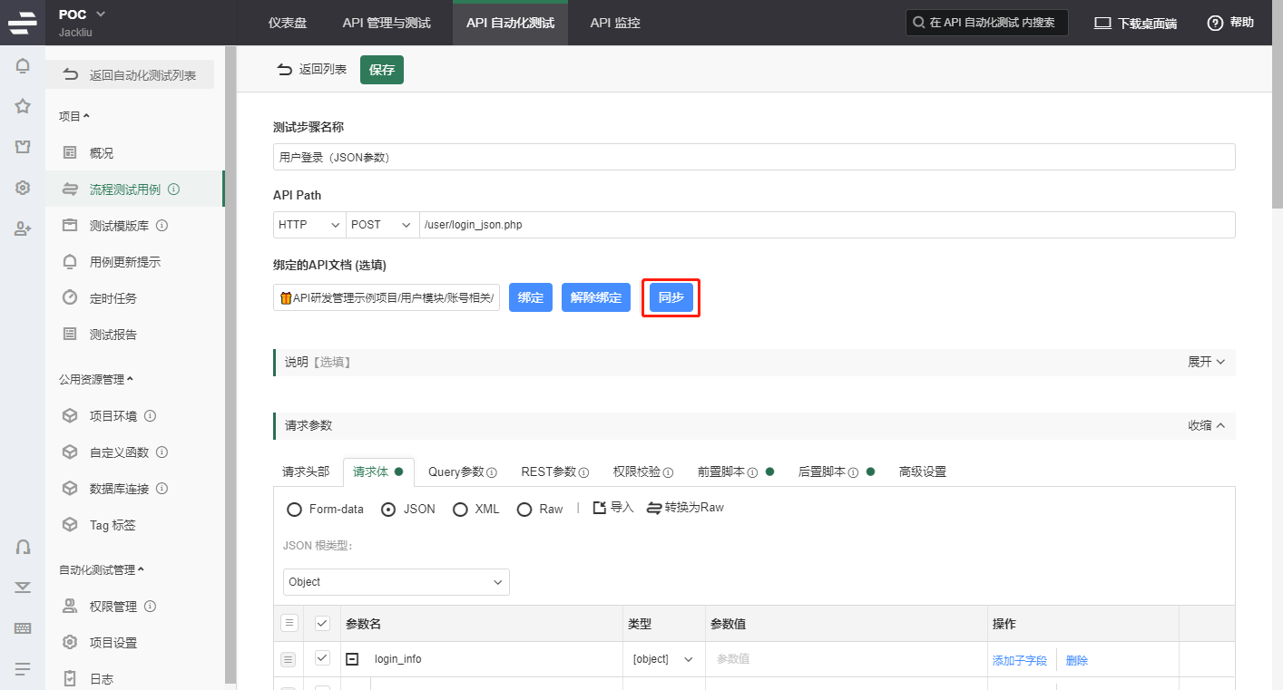 当API文档发生变化时,可以在测试步骤的编辑页面点击同步按钮更新当前API测试步骤;