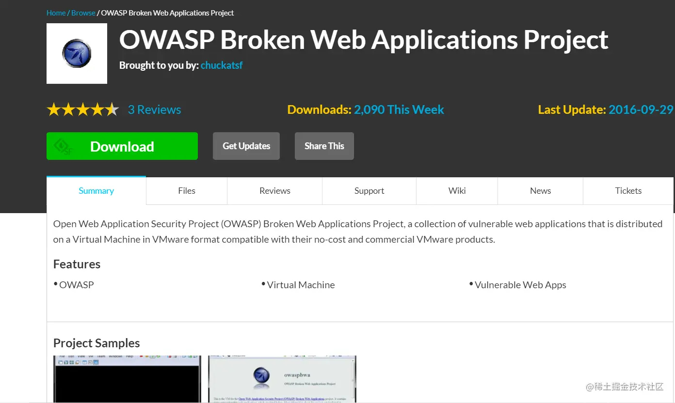 OWASP是一组易受攻击的Open Web应用程序安全项目,分布在VMware格式的虚拟机上,包含了当前几乎全部类型的漏洞,例如:SQL注入、XSS攻击等等。它是由一家非营利性组织——OWASP 基金会提供持续性支持,可免费下载与使用。