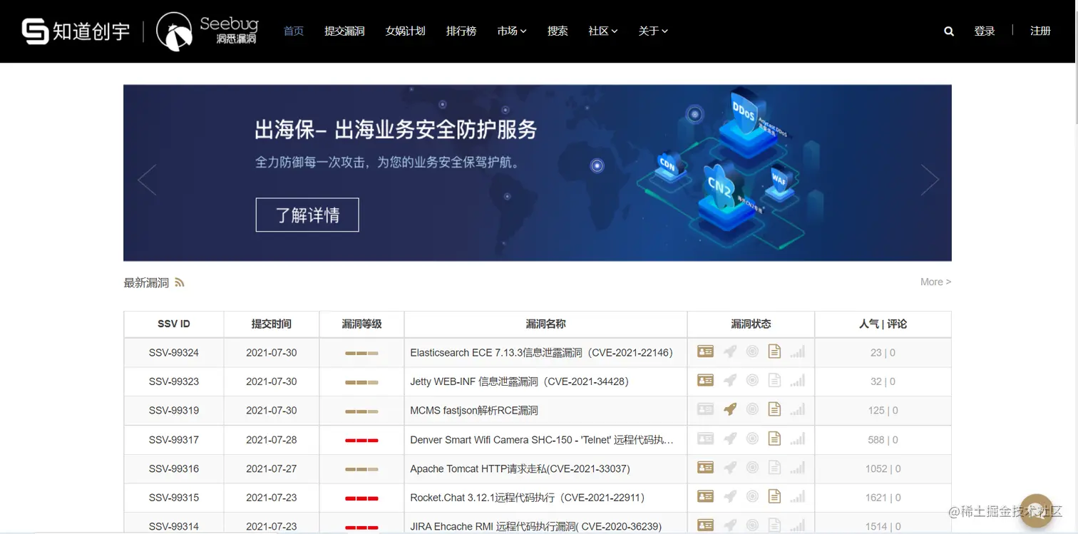 Seebug,洞悉漏洞,让你掌握第一手漏洞情报!Seebug 提供最新漏洞信息、漏洞搜索、漏洞修复、漏洞目录、安全文档、漏洞趋势分析等