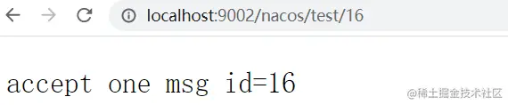 直接调用nacos-consumer的接口,输入地址:http://localhost:9002/nacos/test/16,返回信息如下图则表示相互调用成功: