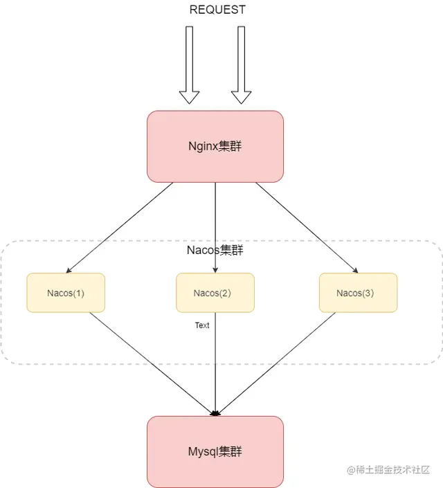 看了陈某画的图是不是更清楚了呢?请求进来先共同Nginx集群进行转发到Nacos集群中,当然为了保持高可用,数据库必须也是集群模式。