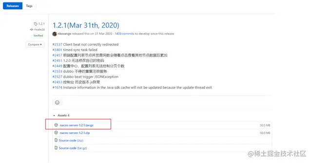 根据上面作者选择的Spring Cloud Alibaba的版本,对应的Nacos版本是1.2.1,直接去GitHub(github.com/alibaba/nac…