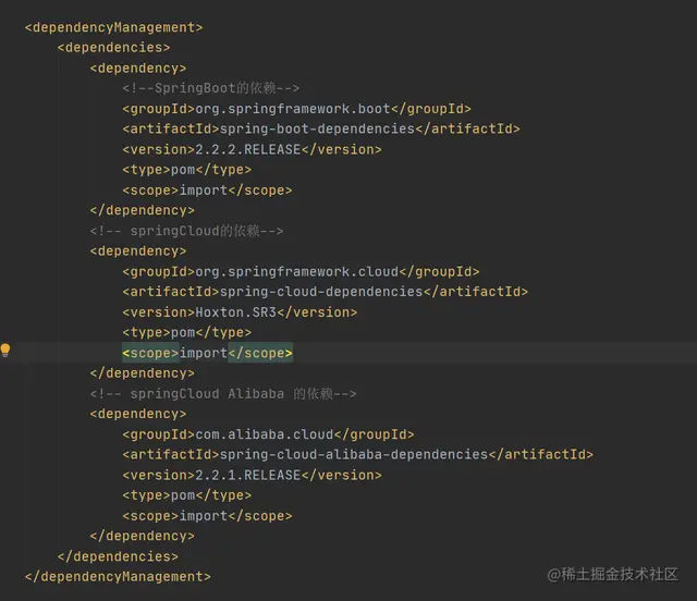 由于父模板中指定了spring-cloud-alibaba-dependencies的版本,子模块中直接引入依赖即可,不需要指定版本号,这样才能达到版本管理的效果。