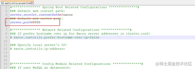 Nacos默认的端口号是8848,那么如何修改端口呢?只需要修改conf目录下的application.properties中的server.port即可,如下图: