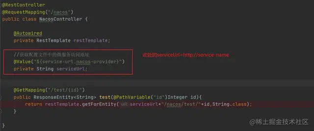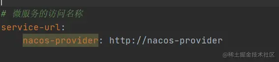 - 上图中的serviceUrl是什么东西呢?难道是IP地址?当然不是,既然nacos-provider和nacos-consumer都已经注册到nacos中,那么可能是可以直接通过服务名直接找到对应得服务,因此这个serviceUrl=http://service-name,如下图: