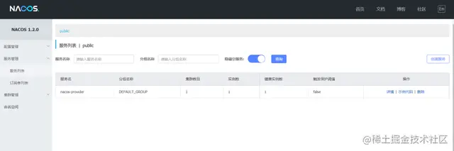 启动成功之后在nacos的服务管理->服务列表这里将会发现注册进入的nacos-provider这个服务,如下图: