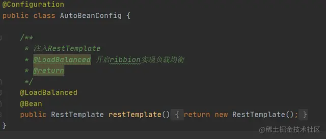- 创建RestTemplate,使用@LoadBalanced注解标注开启负载均衡,如下图: