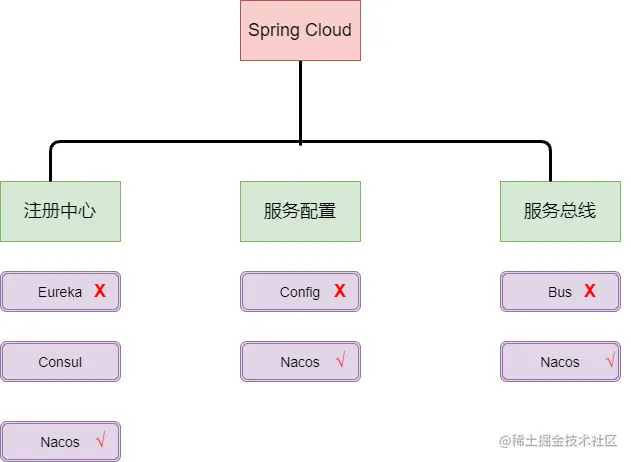 从上图不难看出阿里巴巴的野心,一个Nacos干掉了Spring Cloud的三大组件,分别是注册中心Eureka、服务配置Config,服务总线Bus。