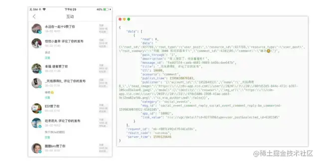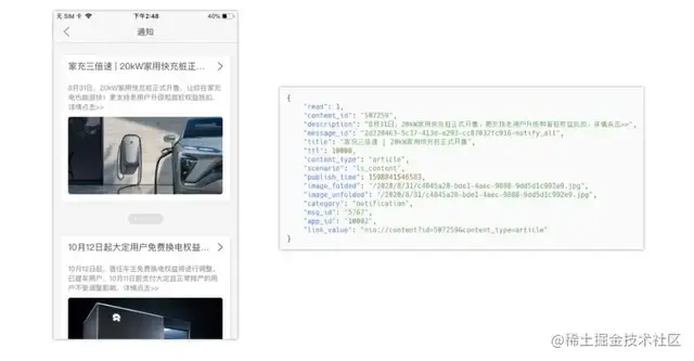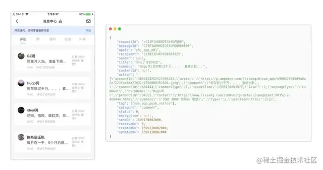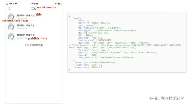 对比之后,界面元素的各个字段就比较清晰了。action 对象中,用来控制 查看详情 按钮,具体根据不同的 category 来控制不同的行为,因为现在的通知消息为一篇 文章,所以 点击 查看详情,就是拉去对应文章的信息,action 中 productId 就是指向的文章的主键 Id