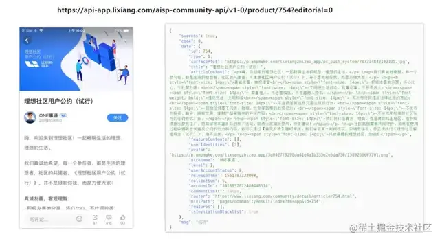 点击跳转至 详情页,上方展示了 【详情页页面】 【接口 URL 地址】 【接口详情】。可以看到对应的 productId 就是 754.