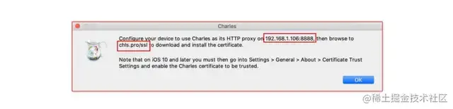点击之后的提示框中 192.168.1.106:8888 为手机将要设置网络代理的地址。chls.pro/ssl 为手机下载证书地址。