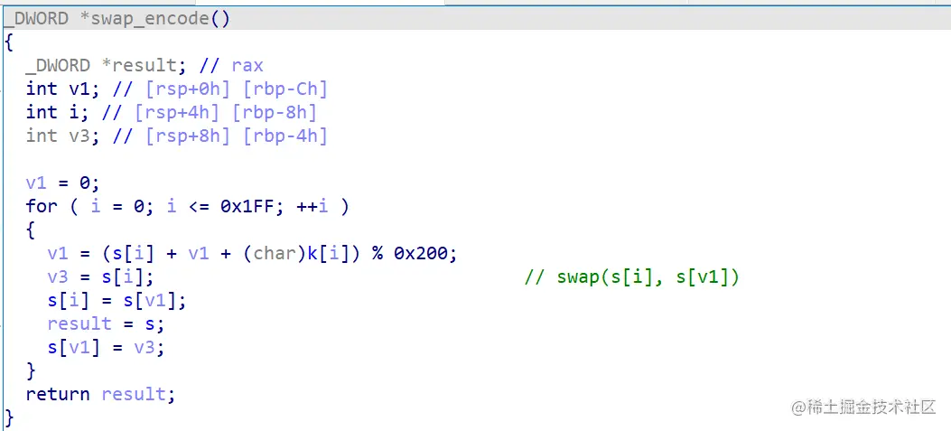 其实看到这几个函数,就可以大概猜到程序的加密是使用的魔改的 RC4 加密(把 RC4 加密中的 0x100 改为了 0x200)。