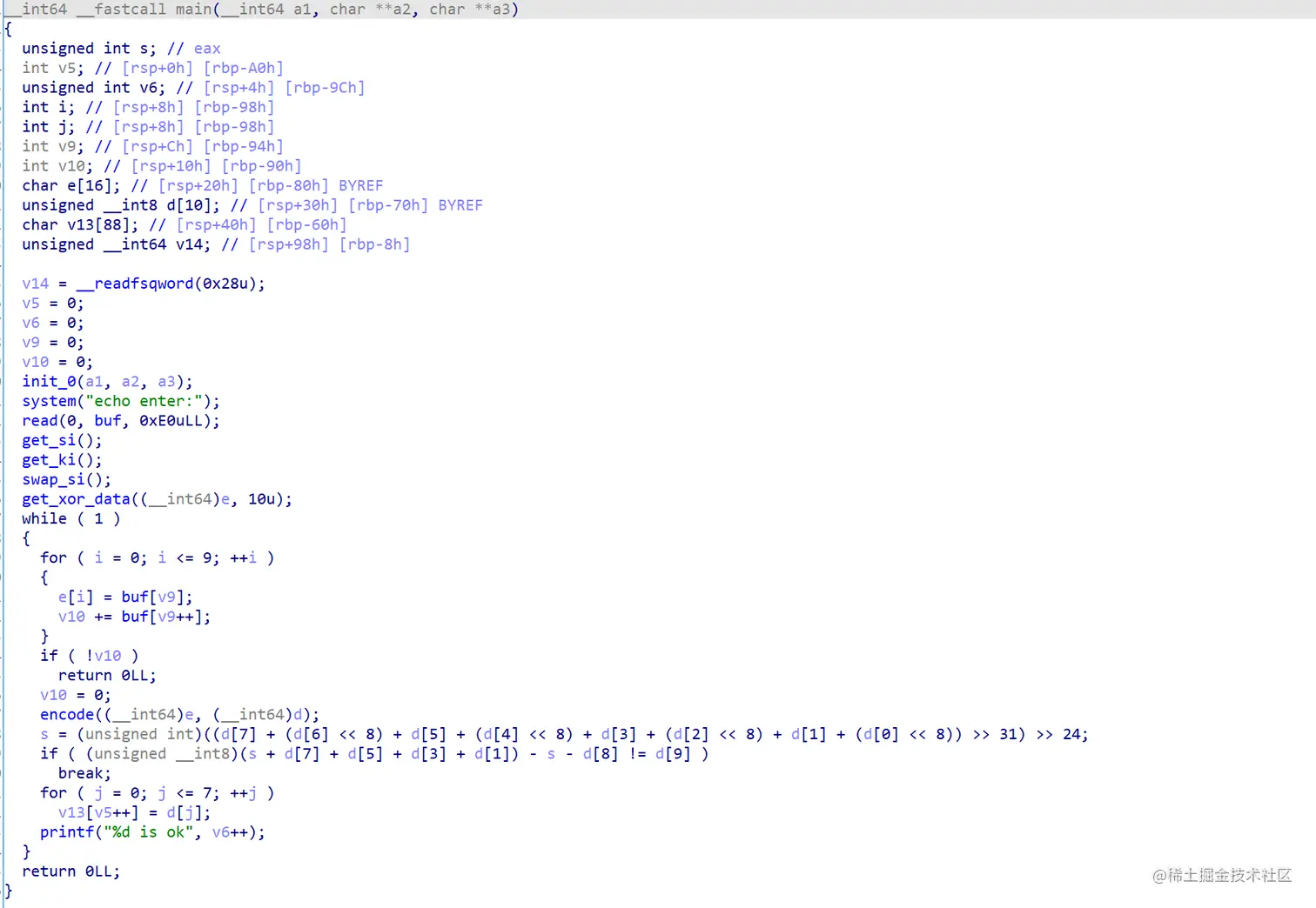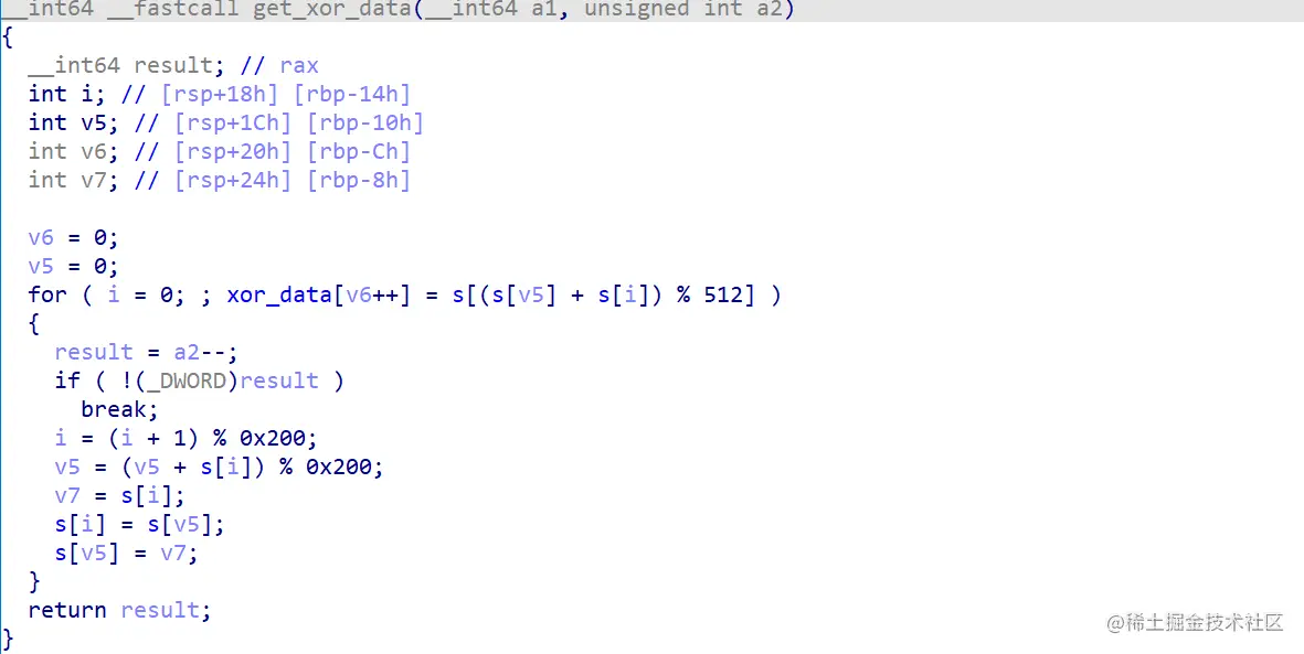 因为异或的数据是固定的,所以实际上这里传入的数据如果全都是\x00,就可以直接得到异或的秘钥,我觉得这里的实现是存在一定的问题的,这使得对代码的分析实际并不必要,只需要提取出异或的内容即可。