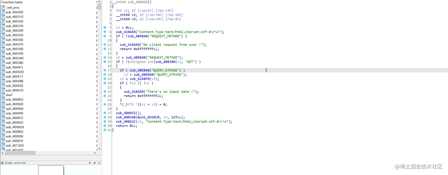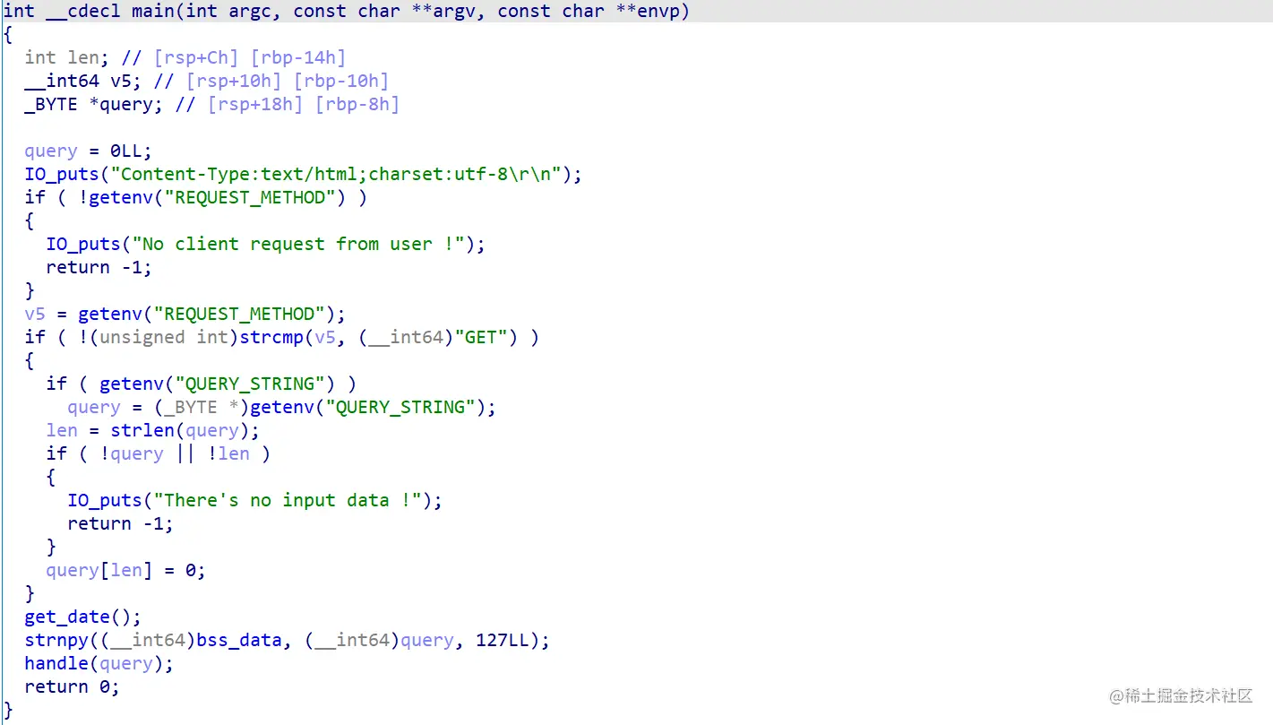 我这里使用的方法是直接 nop 掉 GET 参数的那部分判断,然后 patch getenv(“QUERY_STRING”)为 read 函数,具体的汇编代码如下。