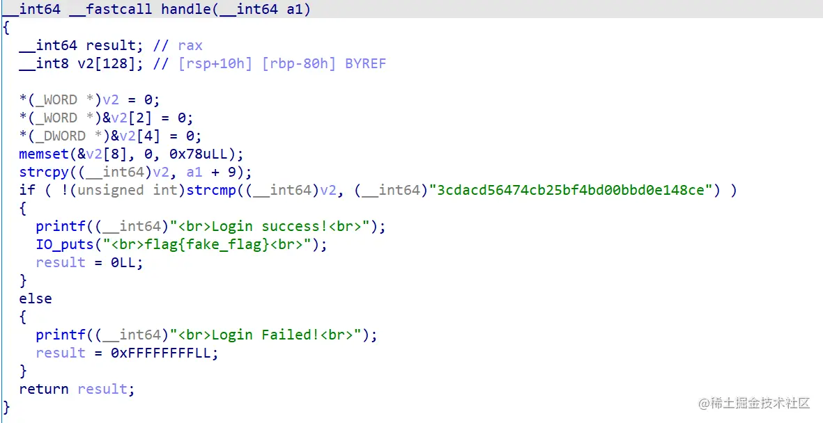 在这个函数中先把栈上的数据清 0,再把参数从第 9 位开始复制到栈上,从九位开始的原因是为了从 password=wjh 中取出 wjh 这个字符串用于判断,因为这个才是 Web 中真正输入的密码信息。