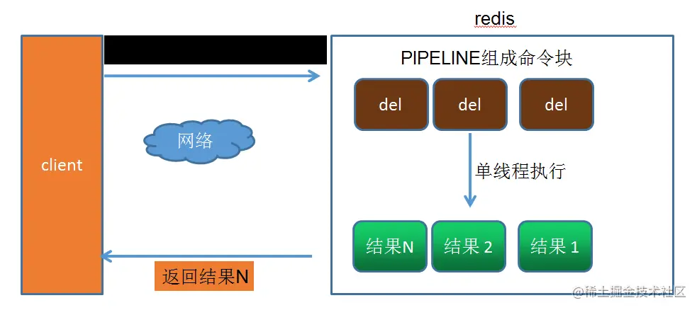pipeline是多条命令的组合,使用PIPELINE 可以解决网络开销的问题,原理也非常简单,流程如下, 将多个指令打包后,一次性提交到Redis, 网络通信只有一次