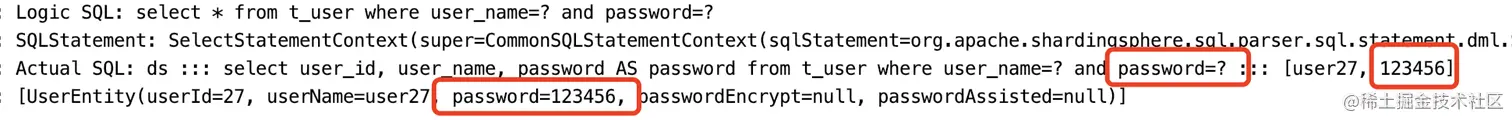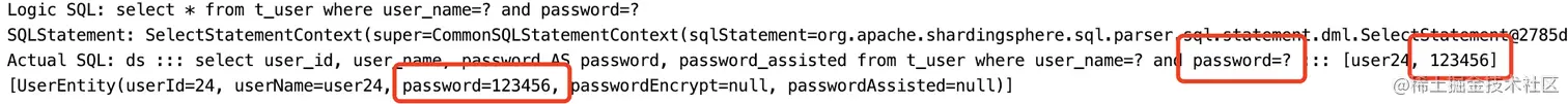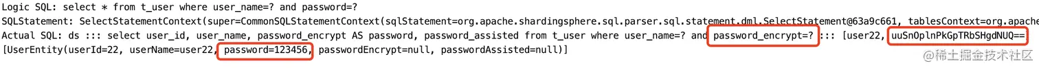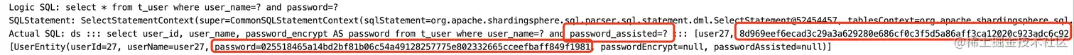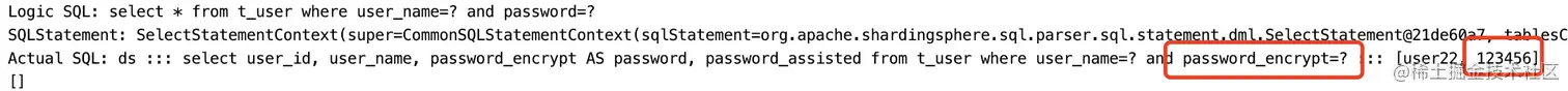 2、查询时,spring.shardingsphere.props.query.with.cipher.column为true时,通过辅助查询列查询,而返回的数据为密文列