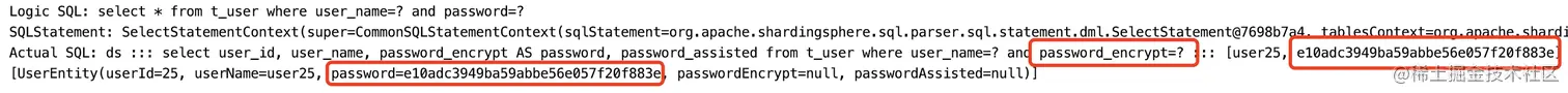 2、查询时,spring.shardingsphere.props.query.with.cipher.column为true时,通过密文列查询,由于SHA256类似MD5加密,所以返回的是密文数据