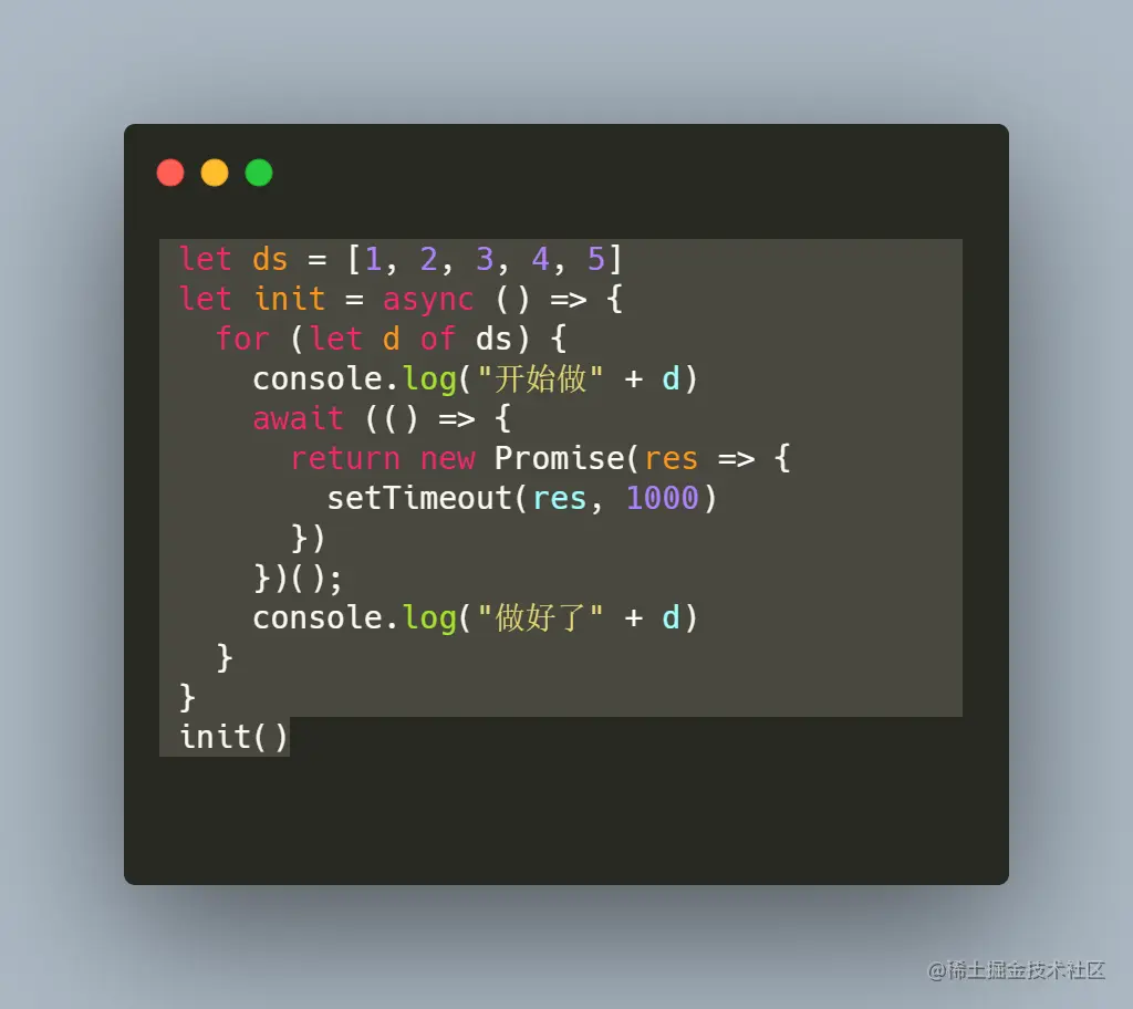 let init = async () => { for (let d of ds) { console.log("开始做" + d) await (() => { return new Promise(res => { setTimeout(res, 1000) }) })(); console.log("做好了" + d) } } init()