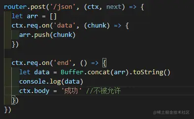 但是我们的监听流的传递是异步的,当我们返回 ctx.body 时,还没有拿到,所以这里需要改成 await promise 形势,然后我们针对不同的 content-type, 组不同的数据处理,把得到的 body 中的值,绑定到 ctx.req.body 上,这样后面执行的中间件就都能获取到了。