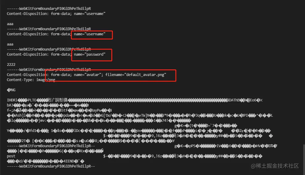 // 我们上面介绍了 multipaer 类型的请求数据格式,使用 boundary 分割,分割的每一组的头和体是以 \r\n\r\n 做的分割(http 协议规定的,我们可以直接查找替换) (看下面图我们的页面和node接收到的结果)