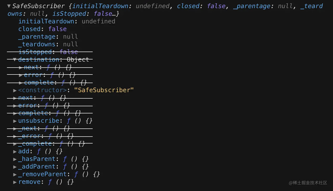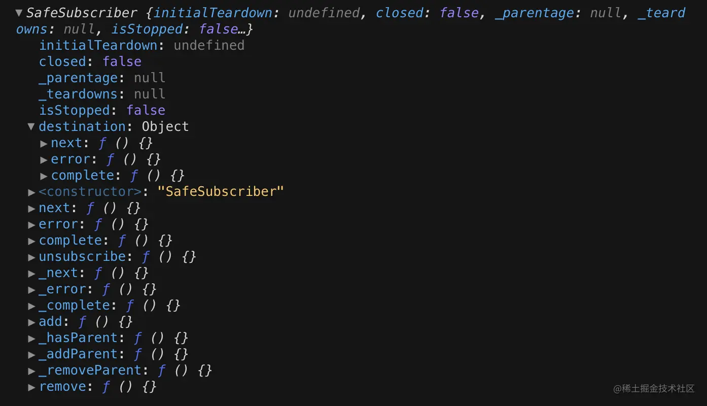 很明显,Subscriber 对象执行 next 函数、error 函数和 complete 函数,最终会调用 SafeSubscriber 对象的 destination 内部的 next 函数、error 函数和 complete 函数,this.destination 与 Subscriber 对象形成了一层代理关系。