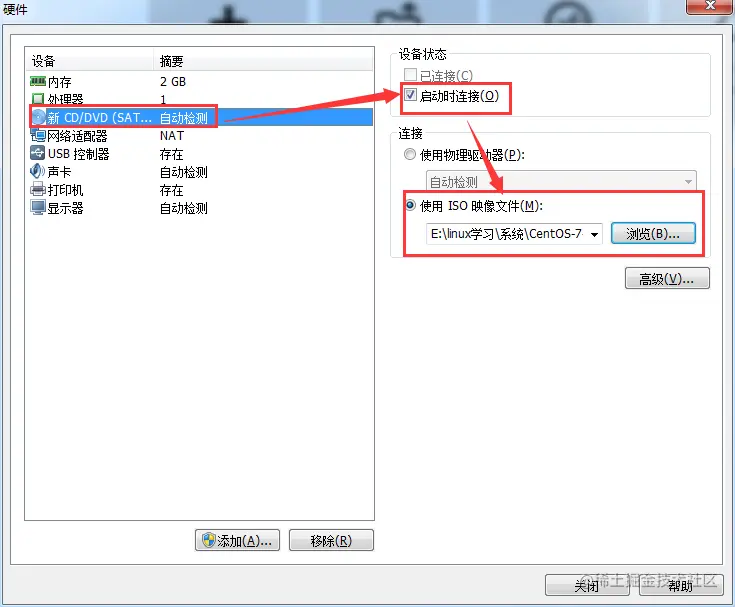 8、(1)选中“新CD/DVD”,设备状态勾选“启动时连接”,连接勾选“使用ISO镜像”,然后点击“浏览”,找到镜像所在目录。