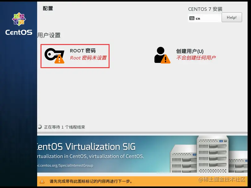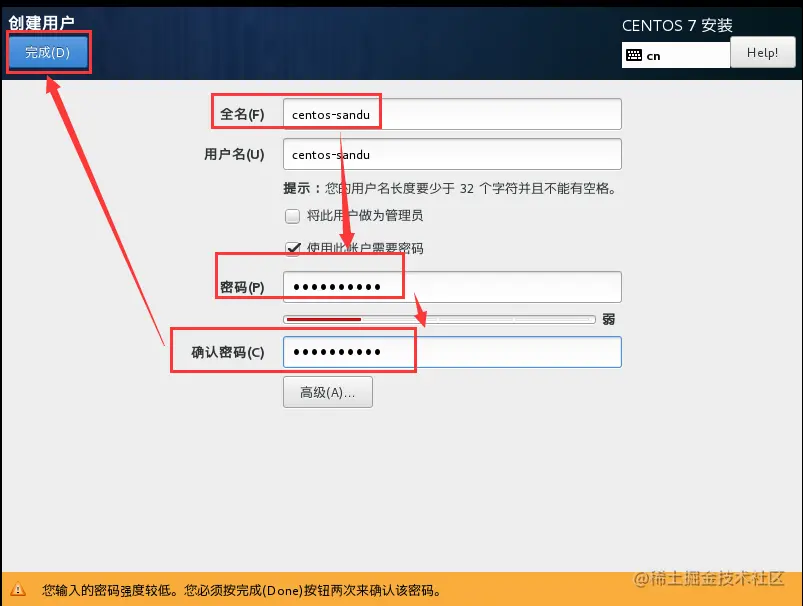 20、(2)设置root密码,因密码强度过低,需双击两次“完成”。