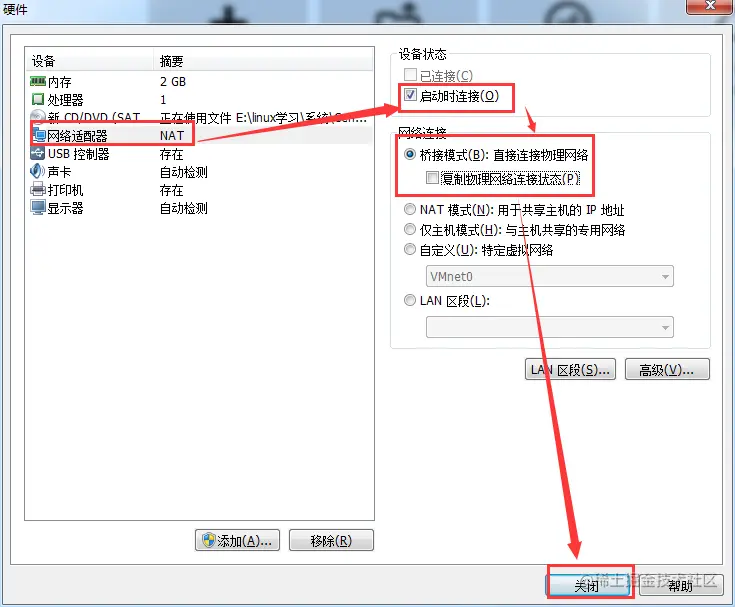 8、(2)选中“网络适配器”,设备状态勾选“启动时连接”,网络状态勾选“桥接模式”,然后“关闭”。